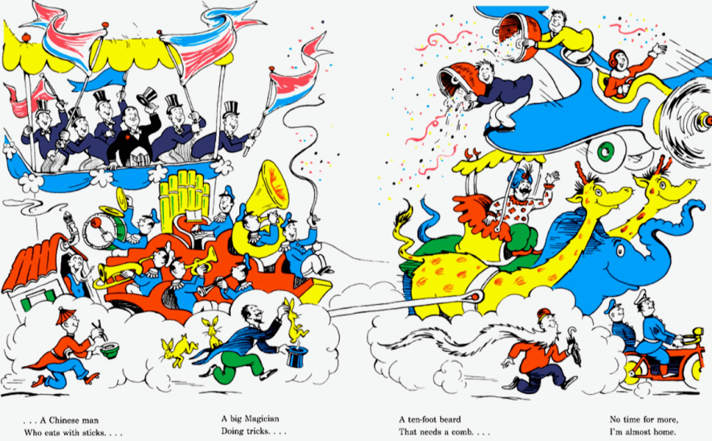“In And to Think That I Saw It on Mulberry Street, published in 1937, we see a man who eats with sticks; he is coloured yellow. He has a triangular, conical hat, a long pigtail, and of course, slanted eyes…”.